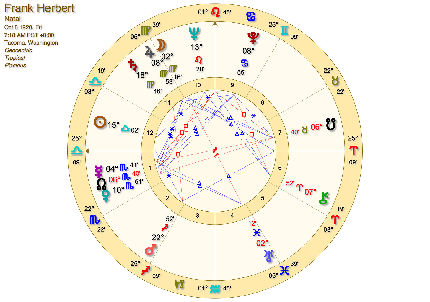 He certainly had the chart of a writer, I thought, what with Mercury in the 1st House forming a Grand trine to Pluto in the 9th House of publishing and Uranus near the 5th House of creativity (not to mention a sextile to the Moon and Jupiter in Virgo, and a conjunction to North Node and Venus). I also found it interesting that his chart had Neptune as the most elevated planet (forming a sextile to the Sun)—considering so much of his Dune series centers around themes of messianism, which is a very Neptunian topic.)