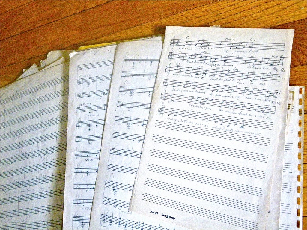 Despite a couple of close calls with success, though, she never broke through into the big-time, which was a source of great disappointment for her. She didn’t have to say so; I could tell. Here is some of the sheet music that she scored from those years, which I found in some old boxes several years ago.