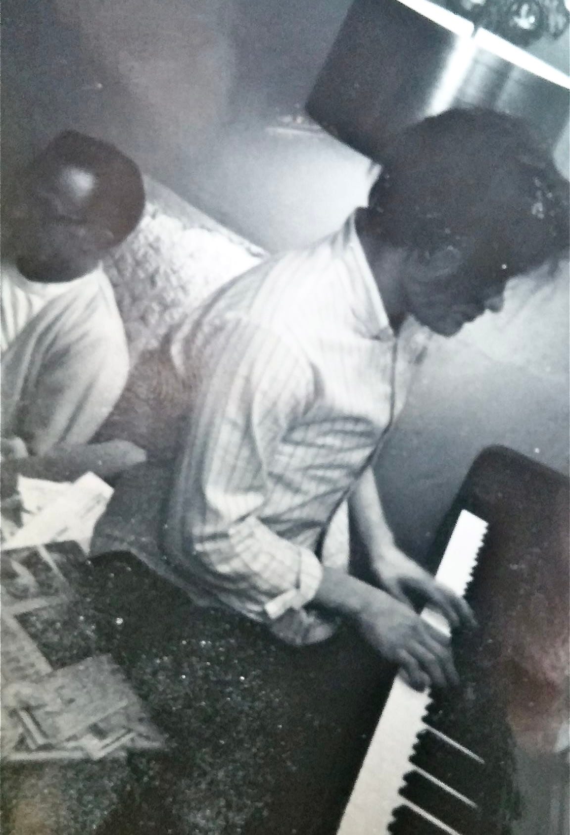 Me at 17, playing the family piano while my father read the newspaper. (I’m wearing a plaster cast on my torso beneath my shirt, after a serious back injury I experienced earlier that year.)