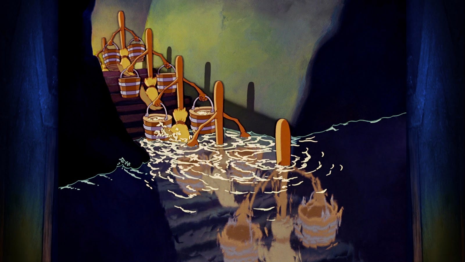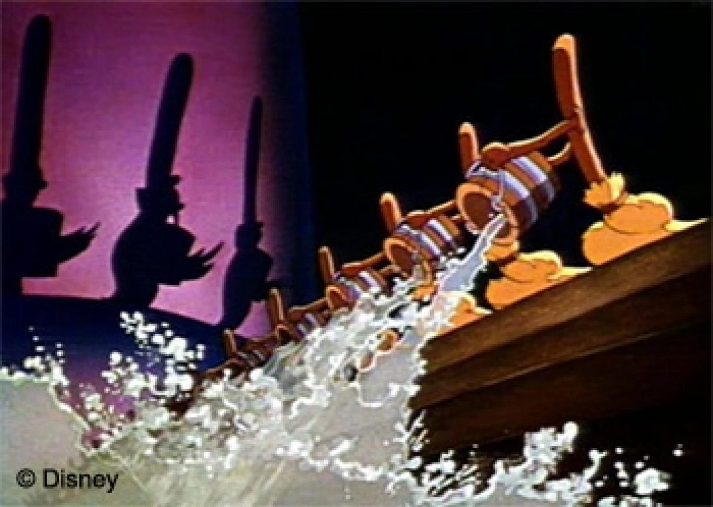 Here we encounter the familiar “man versus technology” motif so prevalent in the Western imagination. The broom that Mickey Mouse commands to perform his chores for him, carrying buckets of water, eventually splits into multiple copies of itself in a way that elicits images of assembly lines, and practically foreshadows cloning, curiously enough.