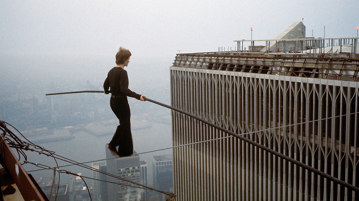 Philippe Petit crossing between the Twin Towers in 1974. (Photo courtesy of Jean-Louis Blondeau/Polaris)